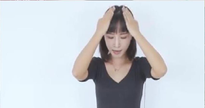 1)以中指與鼻靠齊,四指併攏,往上插入頭髮中。