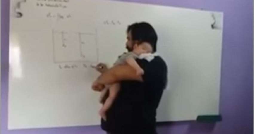 老師抱著孩子在上課,對底下學生來說都是第一次看見,因此有人拍下了這溫馨的畫麵PO上網,