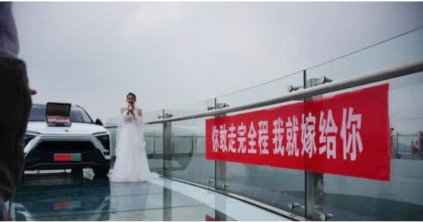 原因就是要讓男友小宇接受最後的婚前試煉,在玻璃廊橋上掛著紅布條,上頭寫著:「妳敢走完全程 我就嫁給你」