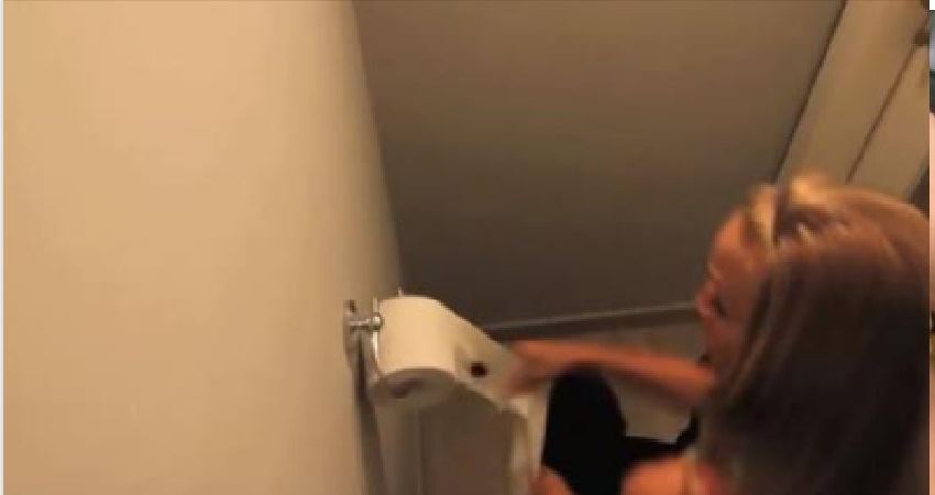 2個小時以後, 完全不知情的女友終於進到了廁所裡上廁所,上完後便到了準備擦屁股的時候啦!