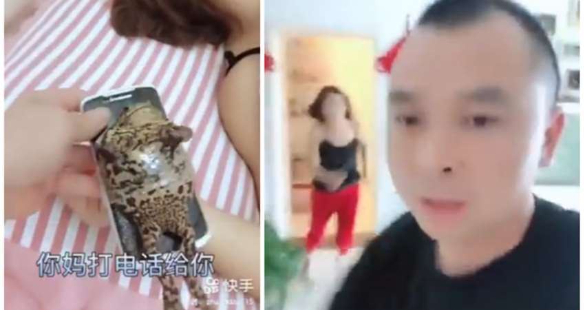 並開始逃跑,但聽到老婆的怒吼,老公的臉色大變,像是真的嚇到,