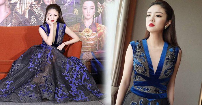 身穿一襲黑藍色深V大洋裝的她,配上一個大紅唇,果然很有皇後風範。
