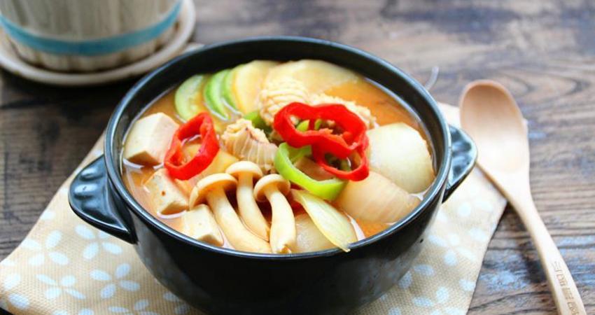 魷魚1條、西葫蘆1個、土豆1個、洋蔥1/2個、豆腐1塊、尖椒1個、紅尖椒1個、白玉菇100克 、韓國大醬3湯匙、牛肉粉2湯匙、韓式辣醬1湯匙