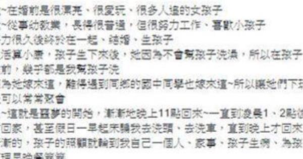 這女的也真的是夠誇張的了, 男生辛苦幫他做牛做馬, 工作完還要幫那個女生帶小孩, 只因為體貼女方不要有太多工作量, 結果呢? 女方還一直找理由出門去找姘頭, 這叫男生情何以堪?! 男生真的不要再養公主了, 家務事真的要公平分攤,
