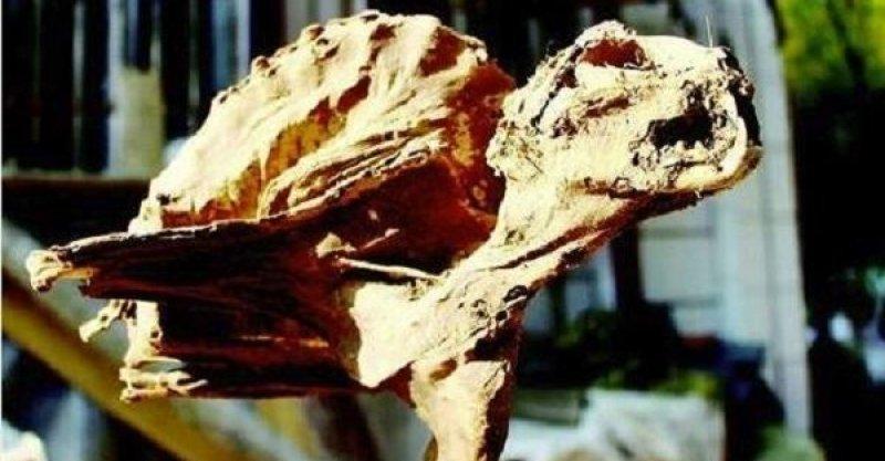 10月6日下午,記者現場看到,這俱生物乾屍就像「木乃伊」,儘管在地下埋藏多年,仍保存較為完好。其體型比普通的雞略大,翅膀輪廓清晰可見,很像一隻大鳥。
