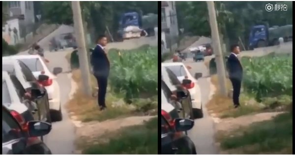 微博流傳一段影片,只見一排迎娶禮車,正開在迎親的路上,新郎卻突然停下說要靜靜,接著又雙手揹在後麵,看向遠方,像是在思考什麼。