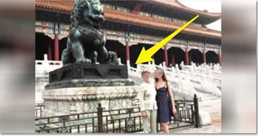 當然這張照片問題不是說不能在故宮那裏拍照,而是石獅子!為何會說是石獅子的關係!?石獅子古代人相信是一種傳統的神物,也就是說是神聖的任何人都不能觸摸或者是拍照合影,就好像是不能和菩薩或是神明一樣,神聖的物品神像,怎麼可以隨便觸摸或者是合照呢!?還有一個傳說是之前道光皇帝在逛紫禁城周圍的時候,因為當時他在石獅子麵前一腳踢死了自己不成材的兒子,於是每當走到石獅子麵前就會看到他兒子死的慘狀,使得道光皇帝非常害怕,便下令紅布把石獅子蓋起來!