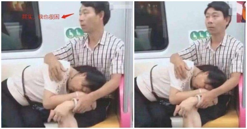 而看起來也一臉倦容的老公發現老婆累到睡著了,也挺著疲乏的睏臉堅持著,一隻手輕柔又穩固地摟住老婆、避免她在搖晃的車廂中掉下去,讓老婆能安心休息。
