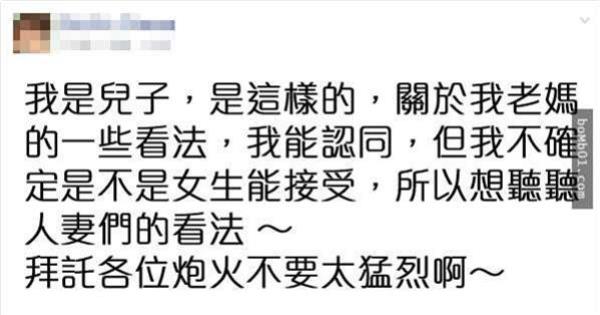 最後一段兒子聽了都傻眼。 結婚是一門天大的學問,除了兩人相處上的問題之外,雙方家庭的結合也很可能會出現一些家庭問題。尤其是婆媳相處更是難解,如果婆媳能相親相愛和平共處,那就要謝天謝地,如果水火不容只能苦了夾在中間的老公兼兒子,因為手心是肉手背也是肉。但如果老媽像今天主角的媽媽一樣直率,到底該哭還是該笑呢? ▼這名網友在臉書中分享自己的狀況。  文長,慎入! 我老媽呢,算是有女王性格,我們家是她說了算,但某種程度上來說,她其實只需要我老爸陪,不太需要她的兩個兒子(我+我弟),大概從我高中開始,我媽就告知了我們兄弟兩的未來。 以下以我媽的角度打出來的~ 擇偶條件: 安分守己、乖乖地不要闖禍就好。 結婚: 婚紗、喜餅、婚宴要搞多大自己決定,畢竟兩個人的事就要自己搞定,老娘不會出錢,也不會收任何紅包錢。如果女方要出,老話一句量力而為,不要打腫臉充胖子。