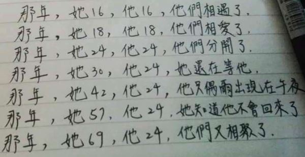 ▼網友在臉書上分享了一張照片,上麵有著手寫的文字,有些網友看不懂,但是有些網友卻覺得這是一場淒美的愛情故事。