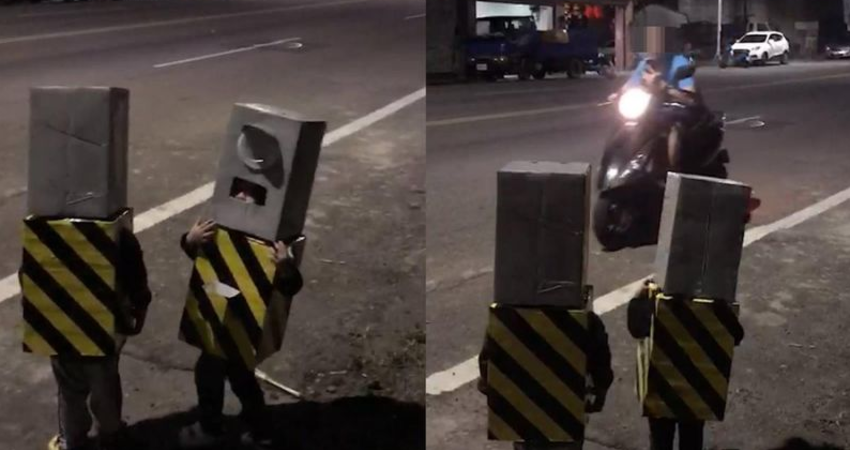 ▼沒想到是家長幫孩子打扮成測速照相機,並站在路邊惡整路人(圖/翻攝爆怨公社)