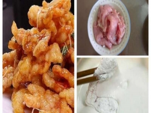 4 , 鍋燒熱,倒入色拉油,燒至5成熱,關小火,隨後把通肌肉拍上一層澱粉,用筷子放入澱粉糊,掛上一層糊後,放入油鍋,一片一片來,這樣才能保持一個很好的形狀,等肉全部下鍋,開中大火炸1分鐘,撈出,繼續把油溫升高至6成熱,肉再下鍋,這一次是為了定型,把肉炸脆,炸至色澤金黃,且部分發淺黑色撈出,備用。