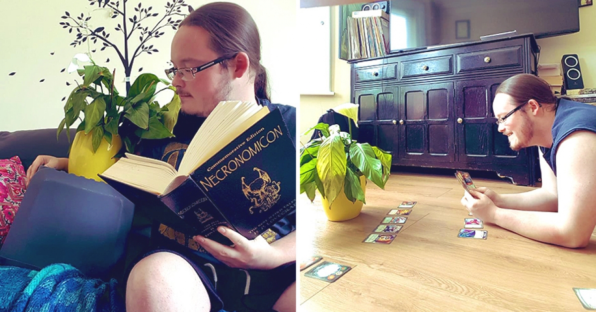 ▼Jack讀書時,特別將白鶴芋抱在懷中。他很細心照顧這盆植物,甚至把它當成有靈魂的寵物。