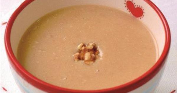 材料: 核桃1杯、白米1/2杯、水6杯、鹽少許、裝飾用核桃1顆。 作法: 白米洗淨後用冷水浸泡1 個小時。 用果汁機將核桃搗碎。 或者可以放入塑膠袋中,用桿面棍壓碎。 將瀝乾水分的白米放入果汁機裡加1 杯水絞碎。 將絞碎的白米、核桃放入容器裡,加5 杯水以小火熬煮20 分鐘,最後再放上小顆核桃作點綴。 米粒煮至透爛為止。 Tips: 熬煮時要不時攪拌。