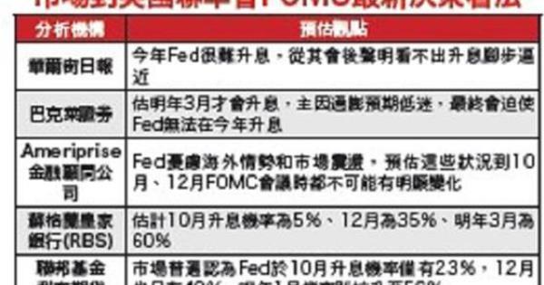 同時,包含美國華爾街日報、巴克萊證券、蘇格蘭皇家銀行在內的多家媒體、金融機構,針對此次聯準會FOMC會議決策所作出的後市預估,均同時指出,就各項據以研判聯準會是否啟動升息的國際金融與經濟情勢、市場變數最新市況分析結果看來,聯準會短期內仍舊沒有本錢可以順利應對,一旦宣布升息後可能伴隨而來的全球性經濟面、市場面、政治面「後座力」的衝擊效應。 連向來為被視為具高度參考價值、持續追蹤其最新走向變化的「聯邦基金利率期貨」走勢,於聯準會宣布不升息後的最新市場反應結果看來,市場人士普遍認為,聯準會在十月宣布升息的機率只有23%,十二月宣布升息的機率也只約49%;市場共識度最高,最有可能啟動升息的時間點,將會落在明(2016)一月間左右。