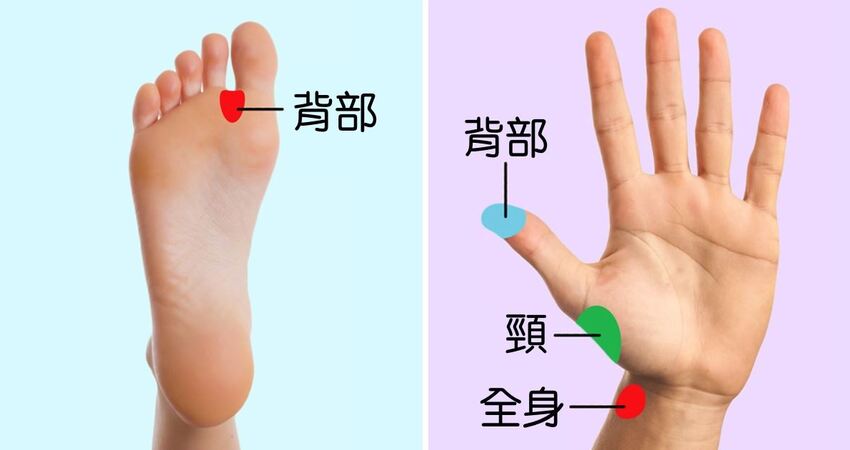 ▼1.按摩圖中手腳的穴位:簡單的穴道按摩,就能緩解身體上的大部分酸痛。閒暇時舒服躺下或坐下,深呼吸,閉上眼睛,全身放鬆,然後開始按摩這些穴位。