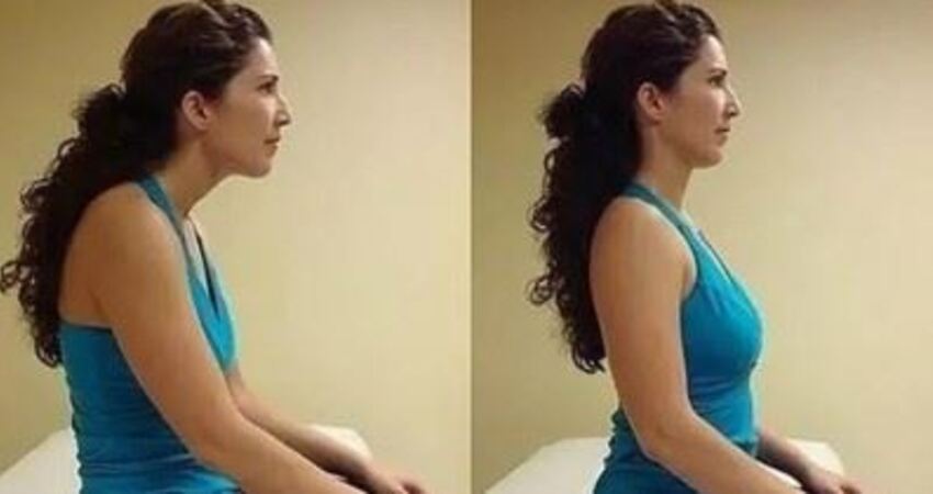 手放在下巴上,把下巴向後推,下巴微微向下,保持5次呼吸