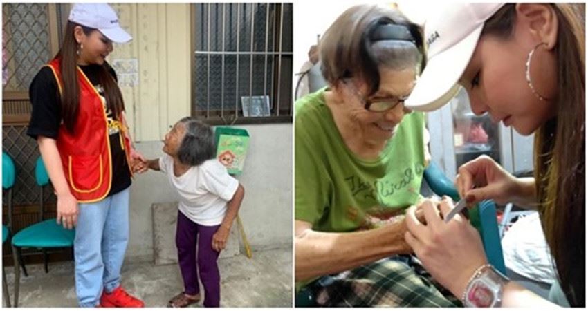 令人印象深刻的還有一位奶奶,她只有一隻手,因此剪指甲時只能靠著雙腳一開一合慢慢修剪,聽聞此事的小甜甜立刻拿起指甲刀替奶奶修剪,並為她塗上美美的指甲油,讓奶奶樂不可支。