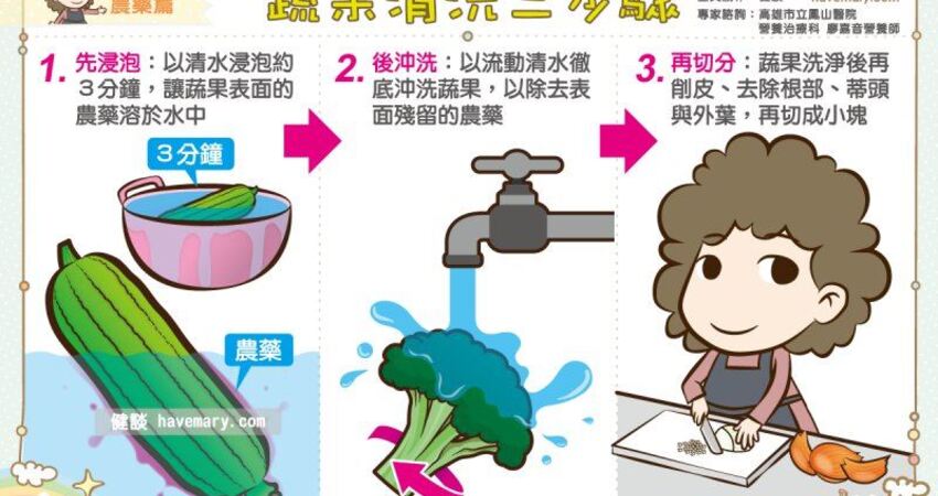吃蔬果有益健康,但是該如何清洗蔬果才能減少農藥殘留呢?高雄市立鳳山醫院營養治療科廖嘉音營養師建議,清洗蔬果可先浸泡、再沖洗、最後才分切,先讓農藥溶在水中,再以流動的水沖洗幹淨,就有助於減少農藥殘留。