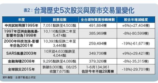 央行雖然放寬桃園等六地的信用管製,但對房市的提振效果仍有待觀察。臺北建商爆出走潮,轉移陣地至中南部,而橫亙在前的是明年總統大選與房地合一稅的兩大陰霾,更讓買盤停滯不前。 臺灣股市從萬點行情的10014.28點,摔落至近一波最低的7203.07點,大跌2800點,市值更從二十八兆元縮水至二十二兆元,一下子揮發了六兆元,「股災」蔓延也令眾多營建類股的股價「腰斬」。 眾多股民大傷荷包之際,連帶地也影響到買房的預算與揹房貸的意願。根據房仲業調查,民眾看壞未來房市的比例增加,擔心「股災」之後,會不會也爆發「房災」問題。 房價上漲難,下跌卻容易 臺灣從2003年SARS之後,走了十二年的大多頭行情,而在政府一連串打房措施下,房市從去(2014)年第四季正式走空,年移轉棟數只有32萬餘棟,今年上半年更只有13.5萬棟,外界預料全年大約只有26∼28萬棟。 臺灣房市未來要上漲並不容易,下跌卻有空間,使得看壞房市的人愈來愈多。群義房屋總經理潘家成指出,受中國股市影響,引發全球股市經歷八月二十四日的「黑色星期一」。
