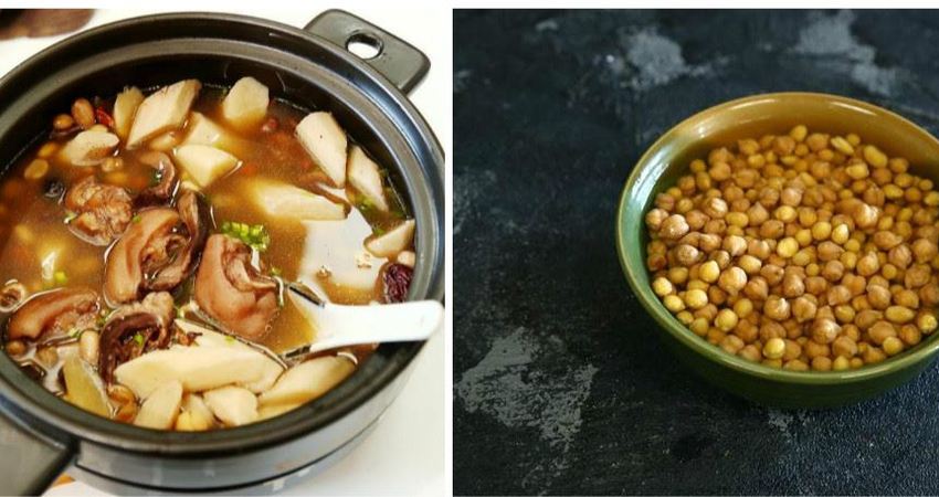 2、黃豆和鷹嘴豆清洗幹淨,如果時間允許可以泡兩個小時後過濾掉水後用,沒時間的話直接洗幹淨直接煲湯也可以。