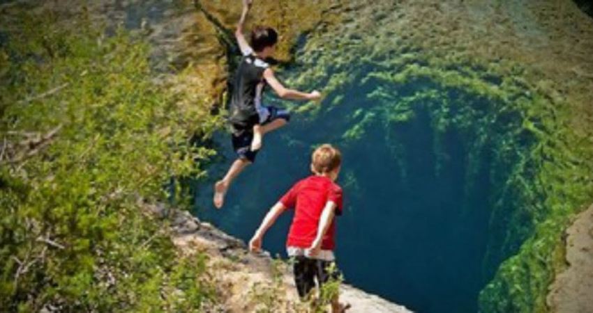 這兩個男孩看上去就像要跳入一個深不見底的黑洞,嚇人一跳,實際上這是位於美國德州的賈科布泉(Jacob'sWell),乍看似乎只有4公尺寬、10公尺深,但跳進去之後卻深不見底,戴氧氣桶的潛水客蜿蜒而下,竟能潛到約有13層樓這麼深。