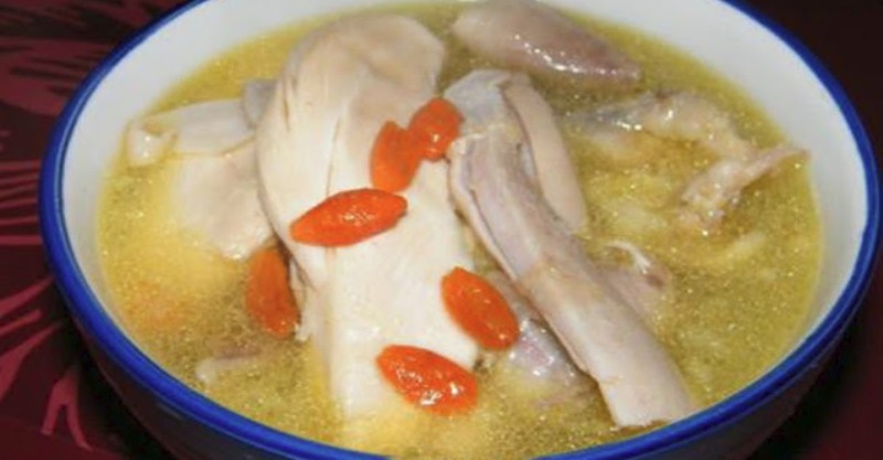 3,把枸杞除外的輔料塞一半的量到雞的肚子裡(把雞頭與雞腳砍掉先)