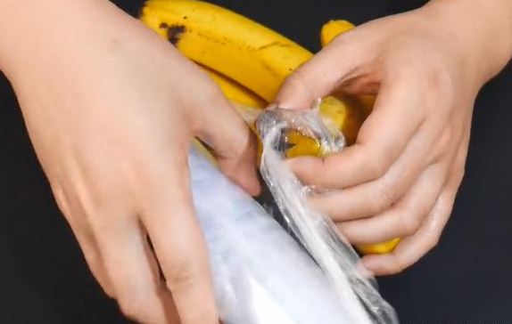 用保鮮膜把香蕉根部像這樣包裹起來,可以減速香蕉自身變褐變熟。