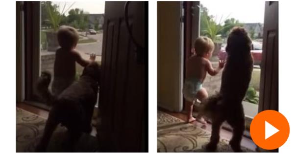 家有一狗如多一子,小娃兒看到父親回來興奮地又驚又跳,更奇的是一旁的小狗也同心齊...萌翻了!