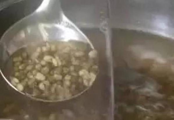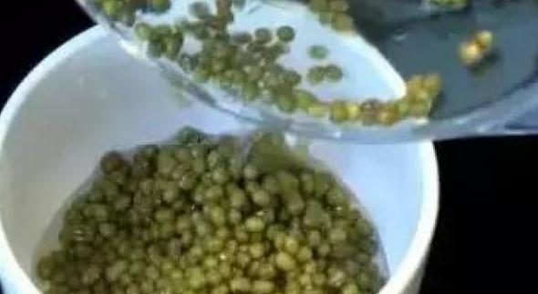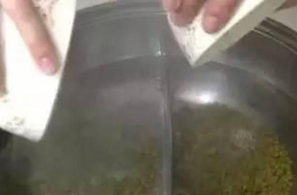 第一步 把綠豆洗乾淨之後,將水濾掉一部分,留剛剛沒過綠豆表麵的水就可以了。