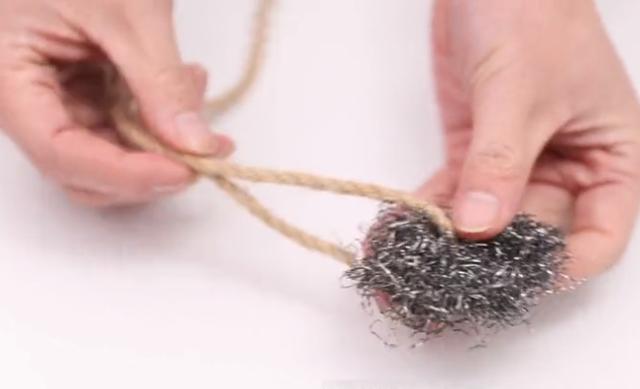 第一個妙招,我們把這個廢舊鋼絲球剪下來一小塊,拿出一個麻繩,盡量拿比較粗一點的繩子,從鋼絲球中間穿起來,這樣就可以了。