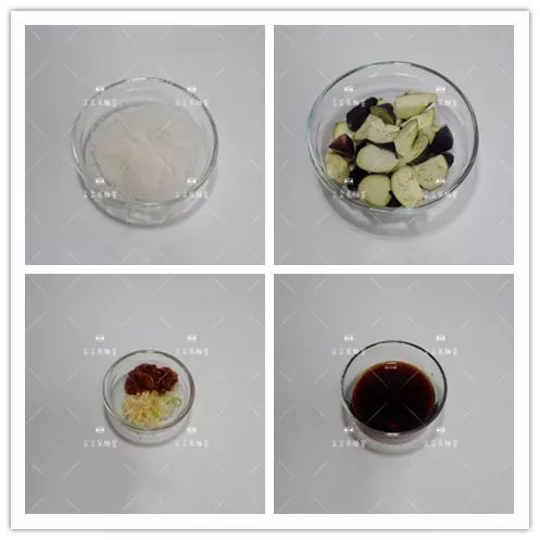 茄子2根、粉絲1把、蒜末5克、蔥花5克、料酒1勺、生抽2勺、老抽1小勺、糖1小勺、豆瓣醬1勺、清水60毫升