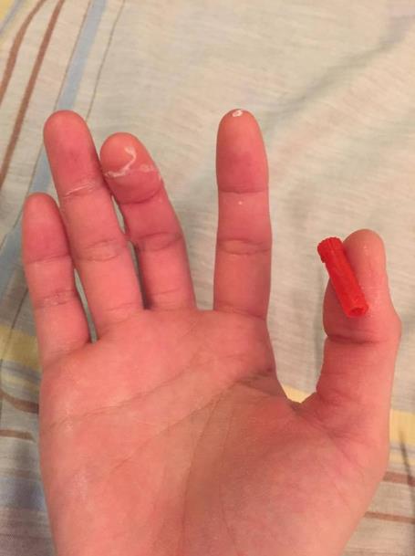 結果,右手手指黏在一起,針的蓋子黏在大拇指上!