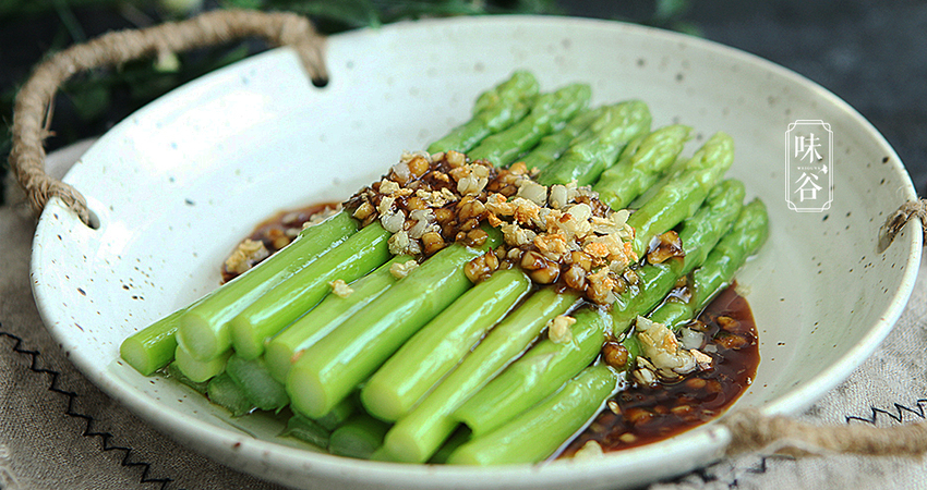 【材料】:蘆筍10根、蒜 4瓣、生抽 2湯匙、蠔油 1湯匙、白砂糖 1小勺、鹽少許