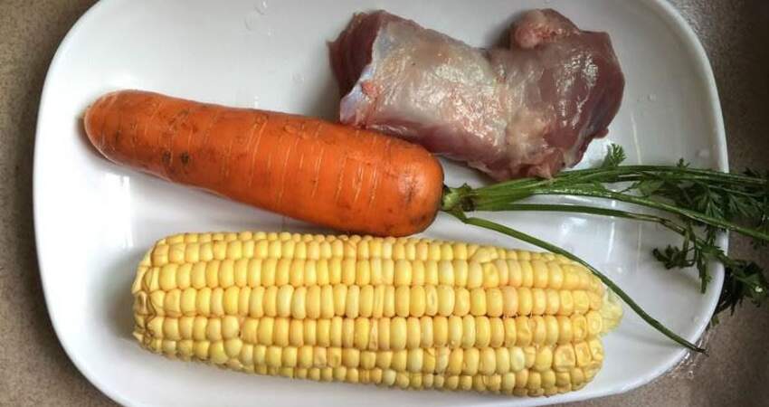 豬裡脊肉 150克、甜玉米 1根、胡蘿卜 1根、料酒 20毫升、醬油 20毫升、精鹽 3克、食用油 30毫升