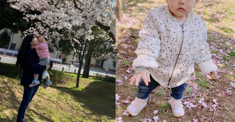 在一張照片中,福原愛抱著女兒站在櫻花樹下,母女二人仰望櫻花,一起享受花海,那畫麵是如此的溫馨。