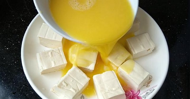 第七步:準備3塊嫩豆腐,切小塊擺盤,豆腐擺好後,倒入打好的蛋液