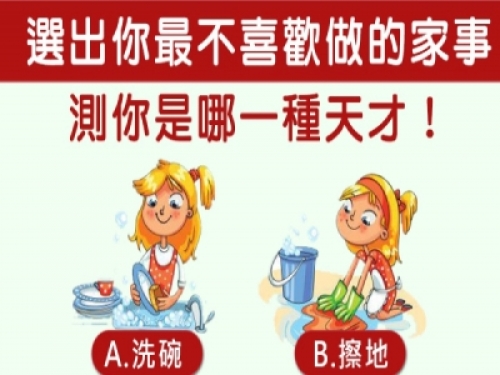 想知道未來適合從事什麼行業嗎?就讓編仔來告訴你是哪一類的天才吧!多了解自己最擅長的,未來會更如魚得水喔!選一個你最不喜歡做的家事馬上就能夠知道答案囉!