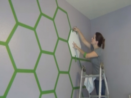 這間房間原本是遊戲室,她打算改造成臥室。準備好一個六角形,水平尺、綠色膠帶、各種需要粉飾的顏色的漆。