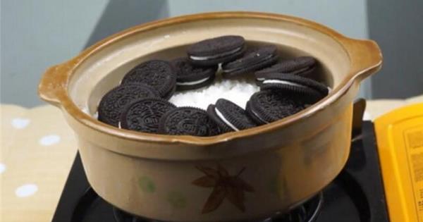 煲仔飯口感香脆,口味多樣,是日常生活中經常可以吃到的食物,本以為運用過了許多食材的煲仔飯已經不能再玩出什麼新花樣了,然而創意無限的網友永遠不會停止帶給我們驚喜。 這下喜歡吃甜食的人有福了,因為新奇暗黑係甜蜜料理問世了,它就是——奧利奧煲仔飯!而且它的製作方法可比一般的煲仔飯製作方法簡單太多。  首先,當然要準備食材和工具~砂鍋、米、奧利奧一袋、雞蛋一枚。  將米洗乾淨後倒入砂鍋中,加入少量水,然後點火加熱。  待米飯有7-8分熟的時候就可以放奧利奧了~這樣擺上一圈,將中間的位置留出來,再蓋上鍋蓋蒸幾分鐘。
