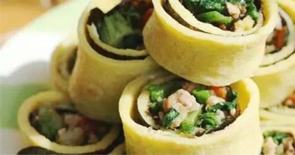 家裡有孩子的媽媽們,這道菜非常適合給小寶寶吃哦,補鐵補鈣味道還好。家裡有老人的親們,這道菜又軟又健康,老人吃也合適極了。饞嘴的吃貨們,管它是孩子吃的還是老人吃的,難道還能阻擋我們愛吃的心麼?  難度:初級 時間:10—30分鐘 主料:菠菜、海苔、雞蛋、肉餡 做法步驟: 1. 菠菜焯水後,鍋裡放油,煸炒胡蘿蔔等配菜,加肉餡炒香,加切段的菠菜  2. 不沾鍋烙薄薄的雞蛋餅3張(烙雞蛋餅可以參照第一期韭菜雞蛋煎餅)
