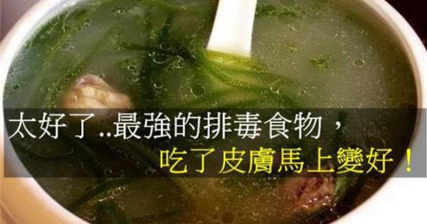 最強的排毒食物,吃了皮膚馬上變好! 環境汙染、電腦輻射、不良飲食習慣等都有可能導致人體產生各種生理垃圾,毒素長期在體內堆積,則會引發記憶力減退、面色灰黃、便秘、痔瘡等係統疾病。因此,如何排毒成為不少女性關注的健康話題。其實在我們常吃的蔬菜中,就有不少具有解毒功效。採用蔬菜排毒法,既簡便易行,又無副作用,何樂而不為呢。 1、海帶  功效:降低膽固醇、排除放射性物質 海帶中含有一種叫硫酸多糖的物質,能清除附著在血管壁上的膽固醇,使膽固醇保持正常含量。海帶中的褐藻膠因含水率高,在腸內能形成凝膠狀物質,有助於排除毒素物質,阻止人體吸收鉛、鎘等重金屬,排除體內放射性元素,同時有助於治療動脈硬化,並可防止便秘和腸癌的發生。海帶中還含有大量的碘,可以刺激垂體,使女性體內雌激素水準降低、卵巢機能恢復正常,消除乳腺增生的隱患。 推薦食譜:海帶燉鴨 做法:將鴨剁成小塊,海帶切成方塊,將鴨和海帶用開水燒開,撈去浮末,加入蔥、薑、料酒、花椒,用中火將鴨燉爛,再加精鹽,出鍋裝盤。