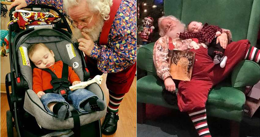 於是爸媽就準備將熟睡中的孩子叫醒時,聖誕老人阻止他們,請他們別吵醒小男孩,而是改成和小男孩合拍了一張兩人一起熟睡的照片。