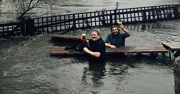 英國近日有大量的連續豪雨,特別是北部河水氾濫成災,已經嚴重影響鐵路運作,更不用說一般的農田、道路,甚至影響部分家庭,造成不小的損失。在這樣的情況下,肯定要煩惱重整家園的問題,不過有兩個外國人樂觀的天性居然卻在這災難中自己成立了「露天酒吧」。