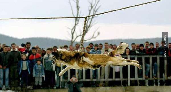 ▼在保加利亞慶祝大齋節的第一天,一些鄉村的村民會進行一種傳統活動:把狗狗綁在繩索上然後讓牠們不停旋轉,直到最後落入水中。雖然狗狗並不會因此而喪命,但心靈也早已受到創傷。