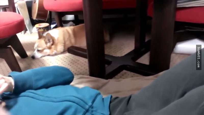 ▼本來狗狗躺在一旁乖乖不動,但一看到男主人拍了女主人大腿,牠就抬起頭。