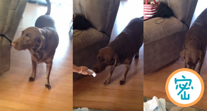 在影片當中,狗狗一開始已經表現得非常好奇,看看主人有甚麼搞作。