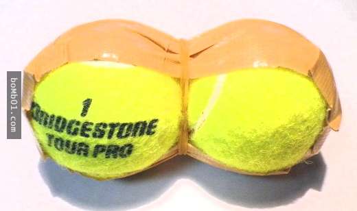▼1. 用膠帶把兩顆平行排列的網球固定著。