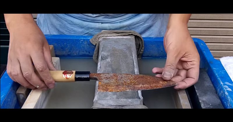 像這樣原本都生鏽到不行的刀子,一般人都會直接丟掉,但是這位師傅竟然不靠磨刀機示範給大家看耐心與技術結合後,令人眼睛為之一亮的成果!