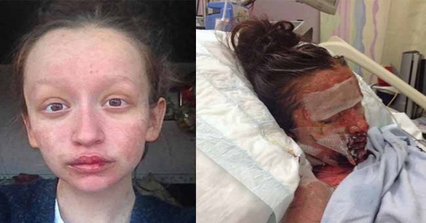 然而,恐怖的事情卻在這時發生了。當醫生為她擦藥膏時,她手部的皮膚突然開始脫落,幾天內整個臉上的皮膚也相繼剝落。